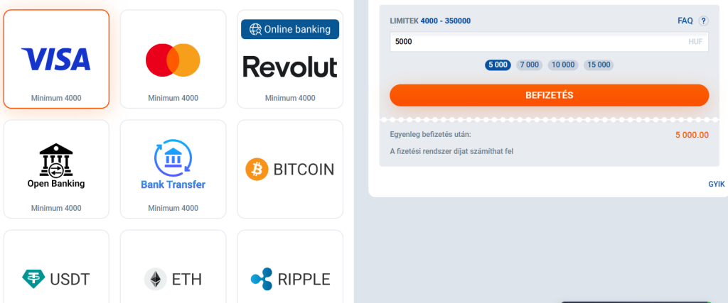 | Fizetési módok | Bankkártya, e-pénztárca, kriptovaluta, helyi megoldások. | Gyors tranzakciók, több valutában. | Magyar forint támogatott, minimális díjakkal. |
